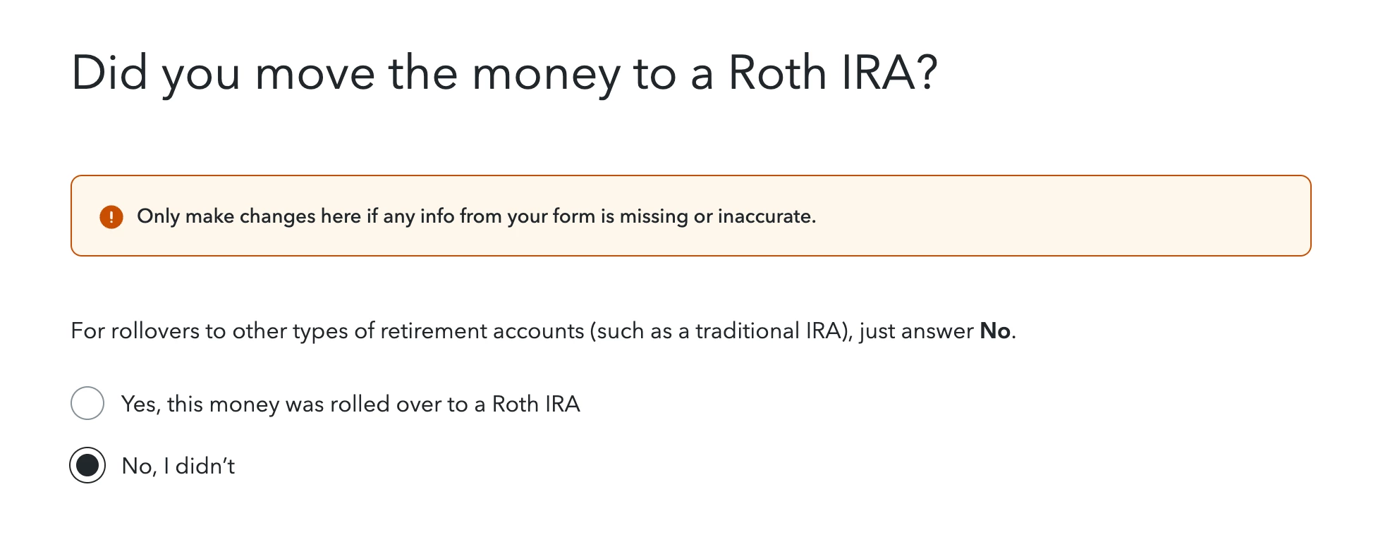 More details: I did a 401k rollover to traditional IRA. Turbotax is treating this as income, even though 1099-R says this is a rollover (code G in box 7) and not taxable (2a is 0). In review, I can see the way it's calculating tax, this amount is included in the calculation as well.