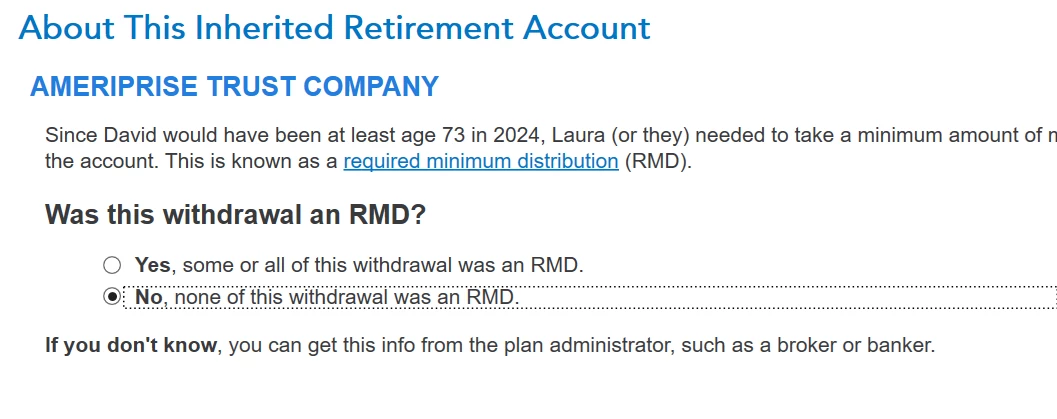 Select "Yes" since you closed the account which would be recognized as a RMD. This really has no impact one way or the other for Tax Year 2024 since the IRS is waving enforcement, but since you closed the account, select Yes, RMD and you're covered no matter what.