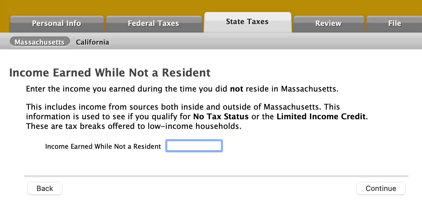 I am filing a part year resident return for MA having moved out of state. TT asks the above question but no gives no guidance as to whether this includes earned income, earned income plus other taxable income (such as dividends and taxable interest), or all income (including state tax exempt income, such as Treasury and MA state municipal interest). Not even sure where I look for this on the MA DOR site. Thanks for any help.