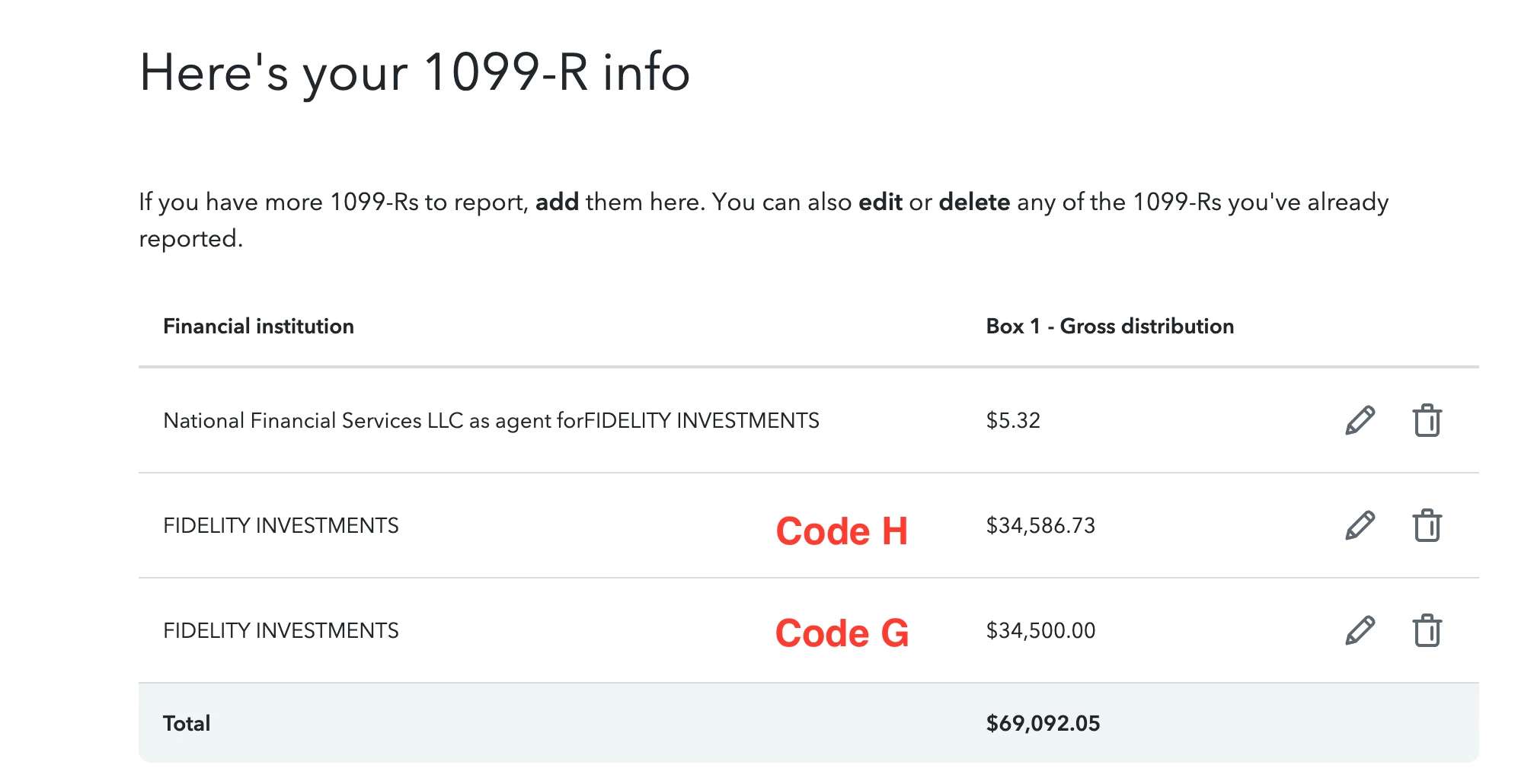 I contributed to Mega backdoor last year which has after tax 34500, i got 1099R and H. when i imported both to Turbotax, it shows the value as total, even though i feel it's not being taxed, but does it look right still? or i should just add one only?