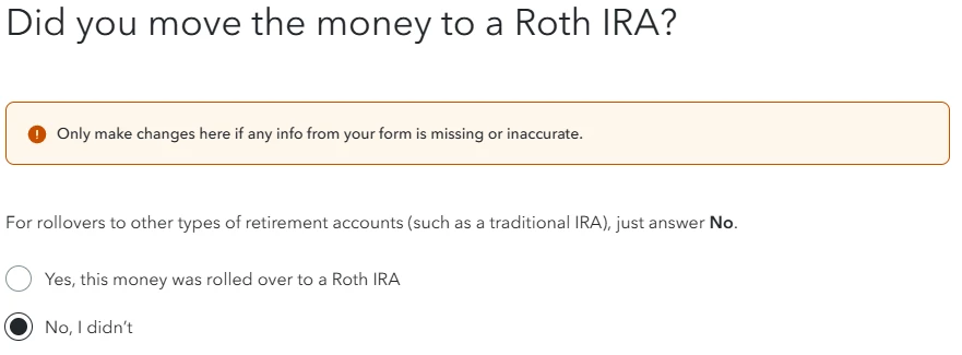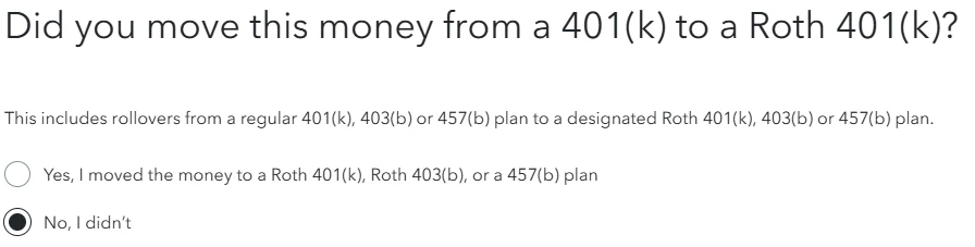 I received two 1099-R documents, one with distribution code G and another with distribution code H. The distribution code G document is associated with a rollover from a 401(k) to a Rollover IRA. The distribution code H document is associated with a rollover from a Roth 401(k) to a Roth IRA. For both documents, I answered the following question as shown below: