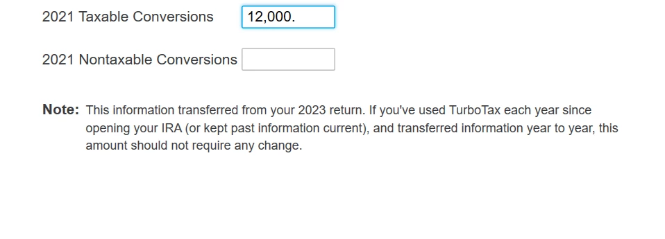 However, after reading my tax 2023 return info, turbo tax automatically put my 2021 conversion of $12000 as taxable, and 2023 conversion of $12000 as non taxable. It makes me very confused. One of it must be wrong.