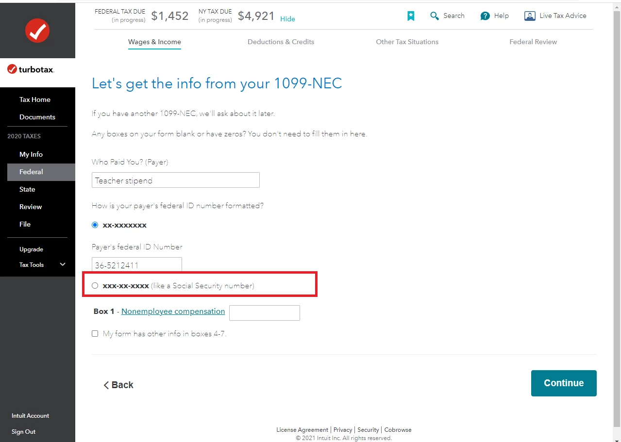 - On the Let's get the info from your 1099-NEC screen, select the radio circle next to xxx-xx-xxxx instead of Payer's federal ID Number.