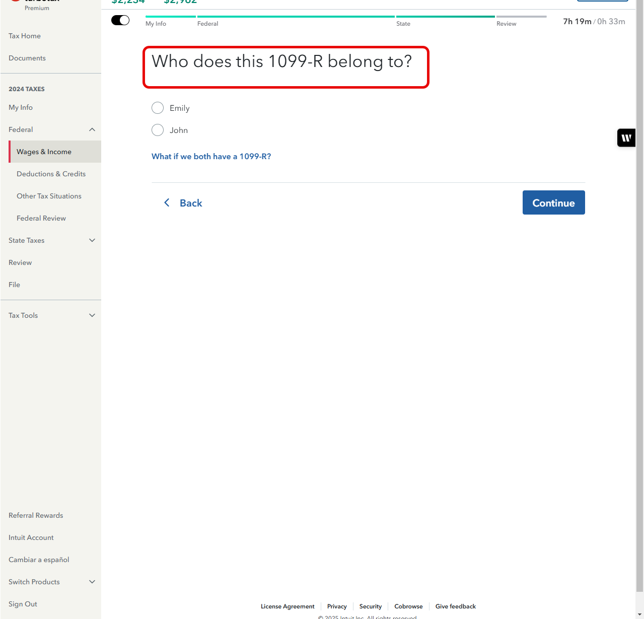 When you get to the screen below, you will see your name and your spouse's so you can select who the 1099-R belongs to.