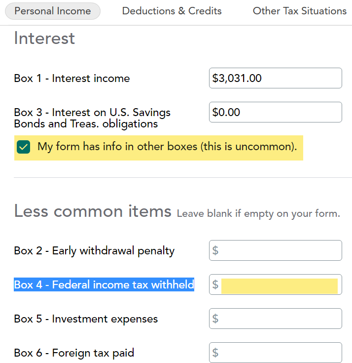 cannot enter amount withheld Block 4 on interest income