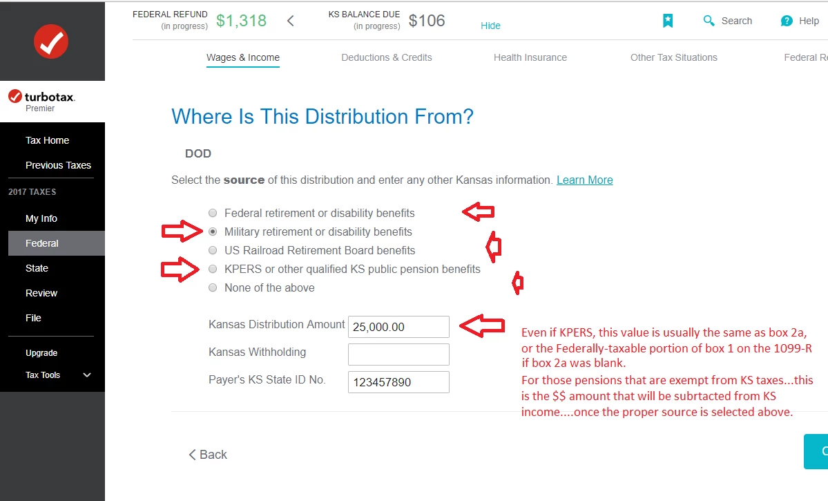 The state of Kansas does not tax federal retirement and all previous years Turbo Tax does it correctly but this year it is saying it is taxable even thought the help box says it isnt
