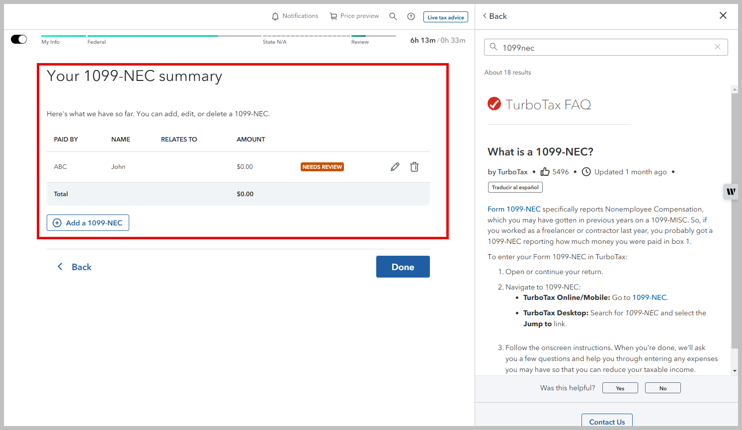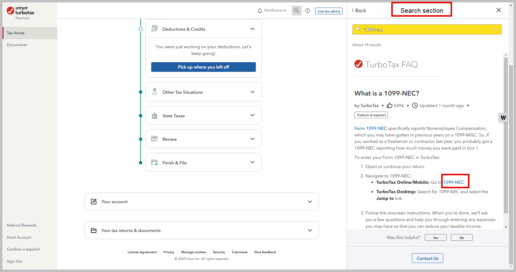 Search (upper right) 1099nec > Click the Jump to ... link or Select What is a 1099-NEC? > begin your entry of Form 1099-NEC by clicking the hyperlink > TurboTax will take you directly to the entry point.