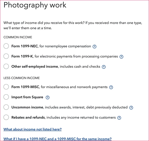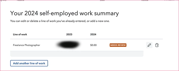 This is in fact what I was forced to do [insert my main invoices in Other income] but then at the end it shows the Self employment income section empty and with the "review" button active and when I proceed, a window comes up telling that I am not a self-employed photographer this year. This is going to be very delicate for IRS!!! your can see: