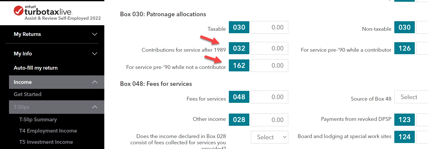 Please enter information/amounts as seen on your information slip in matching boxes in your return as seen below. If you have a box 32, enter that in your return. Past contributions are already included in that amount as seen in this information from the Canada Revenue Agency. If you also have a box 162 then you can enter that information too.