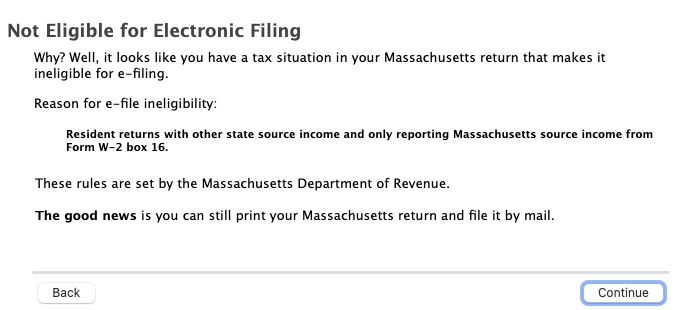 You should not delete the W-2 for box 16 for Massachusetts. The state just does not allow e-filing when there are multiple W-2s.