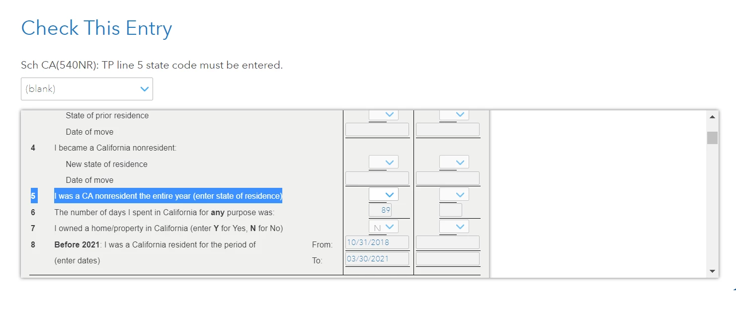 Writing in because I am having an issue with my California Tax return. On my return the Schedule CA 540NR does not have line 4 filled out "I became a CA nonresident (enter new state of residence and date (mm/dd/yyyy) of move" despite me answering the questions which indicated that I became a California non resident in 2019.