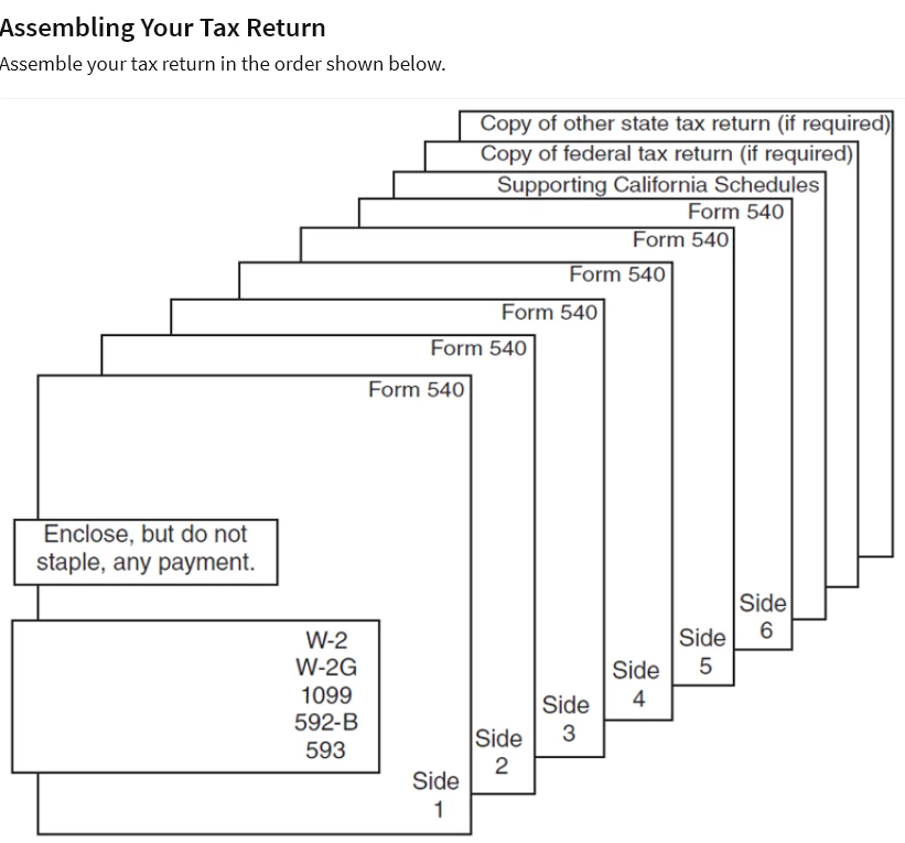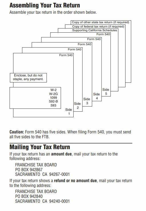 Assemble your tax return in the following order: If required, enclose payment, but do not staple. Attach all forms W-2, W-2G, 1099, 592-B, and 593 to the lower front page of your form 540. Form 540 has six sides. Put the pages in numerical order and send all six sides to the FTB. After side six of form 540, put any supporting California forms or schedules you completed (for example Schedule CA, Schedule D, form 3514).
