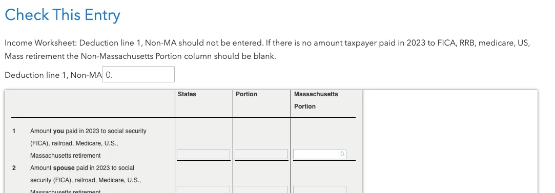 In Deductions, Line 1 ("Amount you paid in 2023 to Social Security (FICA) ... Non-Mass Portion"), TurboTax flagged a zero (0) as an error. However, I am unable to solve the issue.