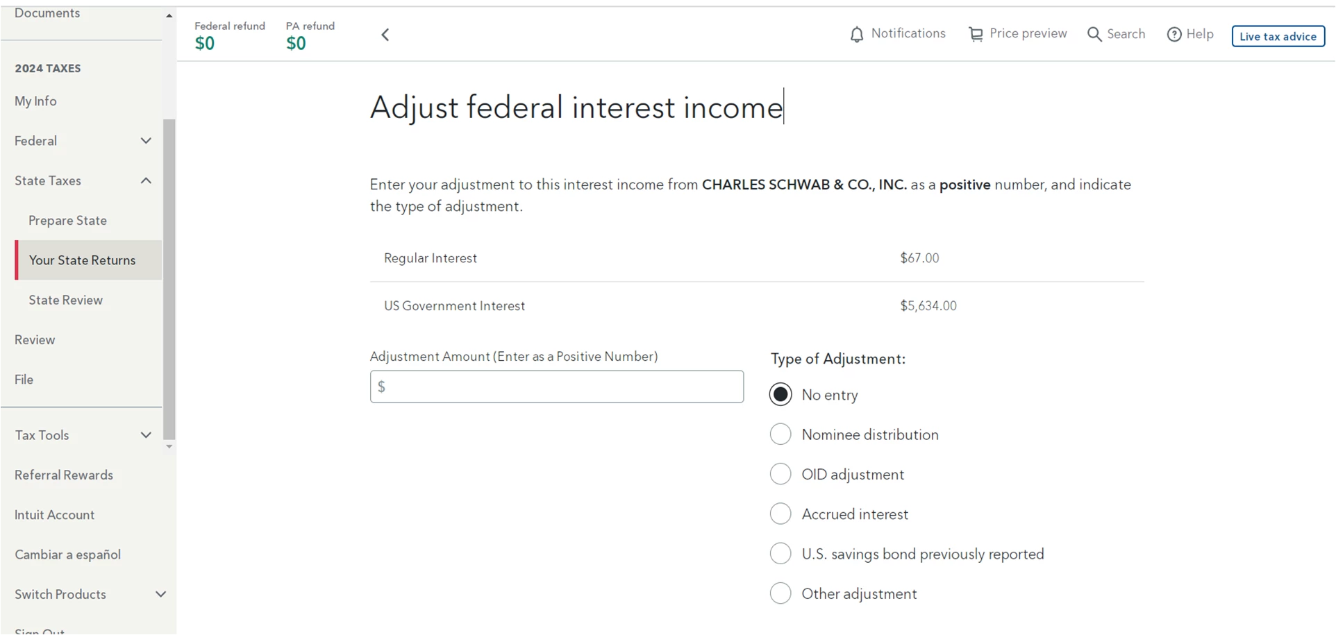 I just want to adjust the $67 of Regular interest income. Why does Turbotax does not let me do that? It seems it should be possible to adjust each interest separately. How do I fix that?
