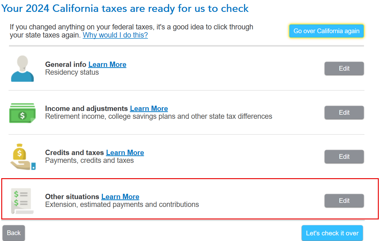 For example, in these screenshots for California, you would be given the option to make changes by selecting edit to the right of "extensions, estimated payments and contributions." That would then take you to the next screen where you are able to select "apply refund to next year" which is where you would make your entry to apply all or a specific amount to 2025.