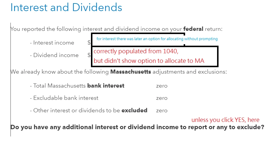 While going through the adjustments and allocations, I see the interest and dividends screen is asking about any to add or exclude. I selected yes and went through the screens where you allocate your income. Finally I came to PY Interest and Dividends. The amount you entered is incorrect and causing the problem. You entered the NY amount and the question wants the MA taxable amount. Once you change that entry, the numbers are right.