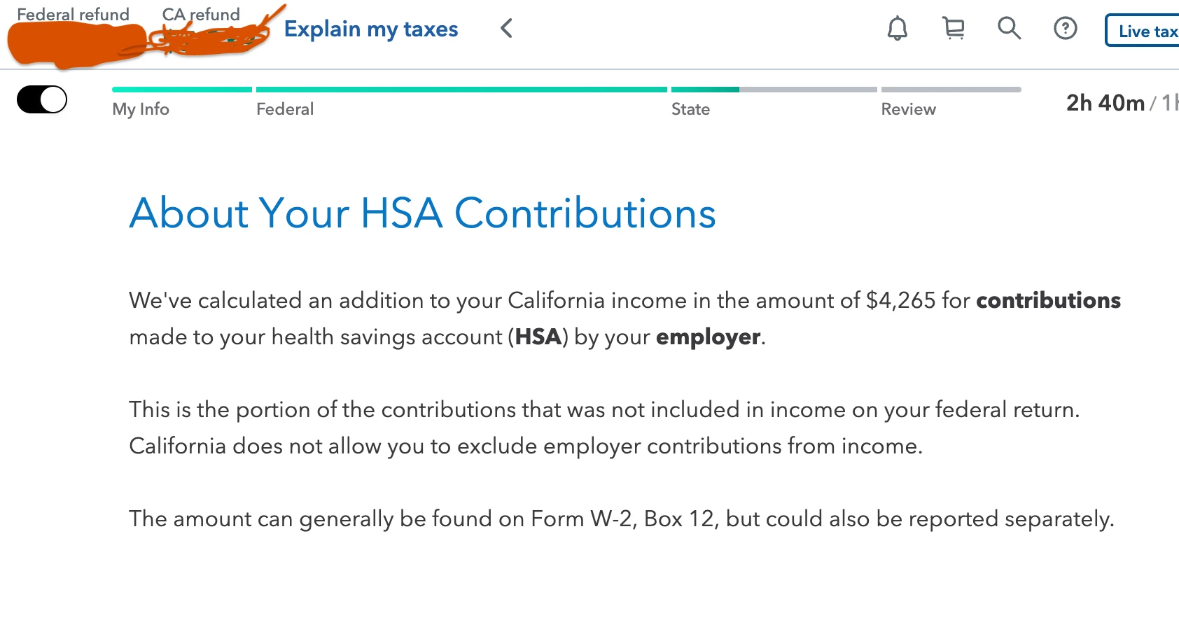 I am seeing this when my return info was transferred to the State of California. I have been using turbo tax and contributing to HSA for many years but I am seeing this first time this year. Also in 2024 I had an excess contribution of $115 which I am already withdrawing. I already selected that option in turbo tax. The employer contributioin is around 25% of $4265 , not all and rest are my deductions from payroll. But I do not understand why Turbo tax is counting all as employer contributions. Does this reduce my California tax refund.
