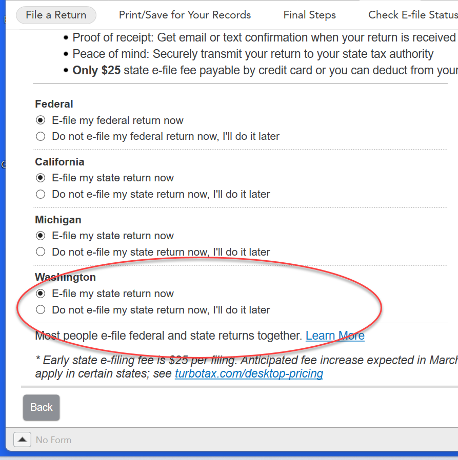 If not, you can also select "Do not e-file my state return now, I'll do it later" in the File section of the program. This will allow you to proceed with your returns and you would not need to do anything with Washington state.
