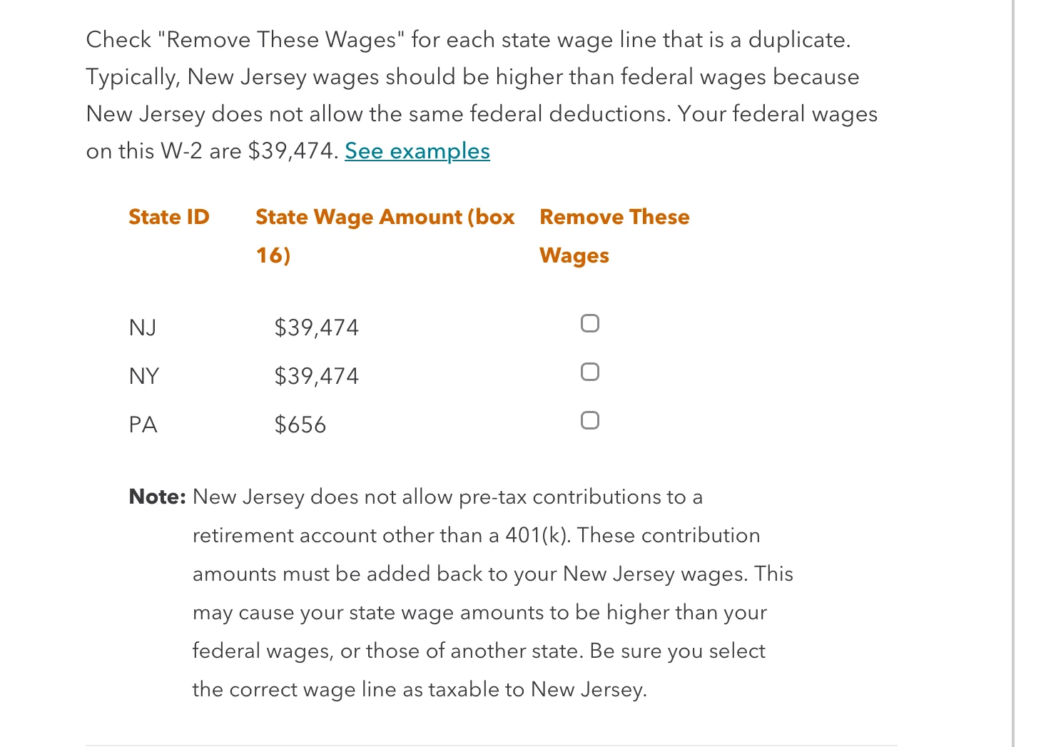 If I worked in NY and PA and live in NJ and am now completing my NJ Resident portion where Nj Jersey says i made 79,000 and i am being taxed duplicate Should I remove NY. The amount shown in NJ is the amount I made in NY, can i remove that from my NJ resident section when it asks if i have any duplicates. in the summary it says i made 79000 in wages but i only made 39,474. help.