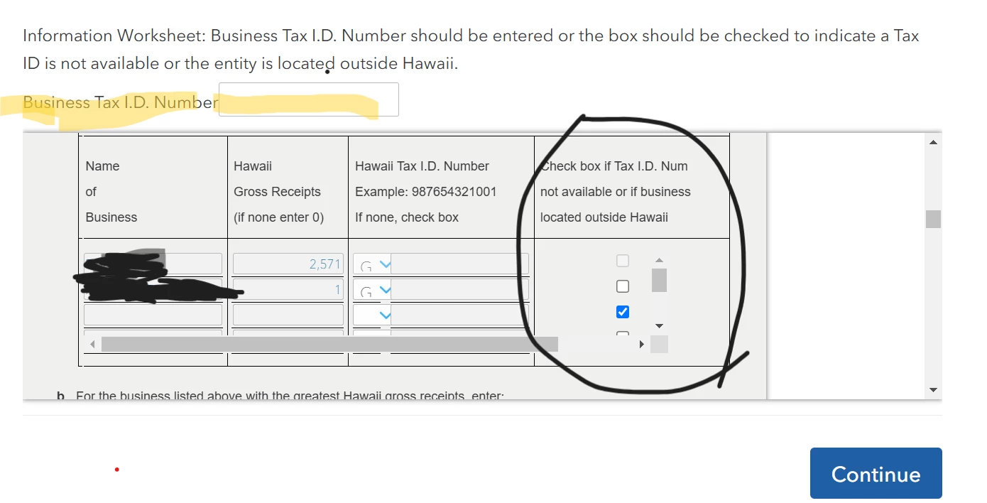 Keep asking me to fix my tax return-input the business state ID number or check to indicate that the business is out of the state. Did both ways but still can’t proceed