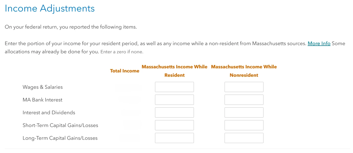 Can someone please clarify, "enter 0 on the screen that asks for the amount of income earned in that state."? Does this mean I should specify $0 of earnings for the non-resident state (MA) for July 1, 2024 - September 30, 2024? On this page in the "Complete Schedule R/NR" section (see screenshot), I tried entering $0 for all rows in the "Massachusetts Income While Nonresident" column, but I was later told that the Schedule R/NR isn't necessary since I'm reporting $0 nonresident income, and my only option to proceed is to remove the Schedule R/NR. After removing the Schedule R/NR and getting to the Summary page, my total income indicated as being taxable by MA was way too high.