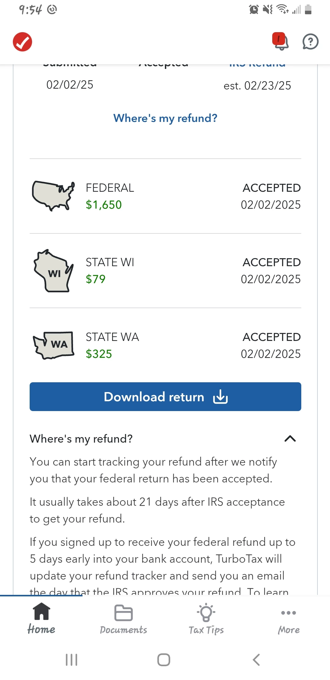 It shows on turbo tax but cant find or check it anywhere else not on irs or Washington state refund page shows accepted here but not anywhere else so I'm confused says your supposed to get it by march 3rd at the lastest it says on a couple different places.