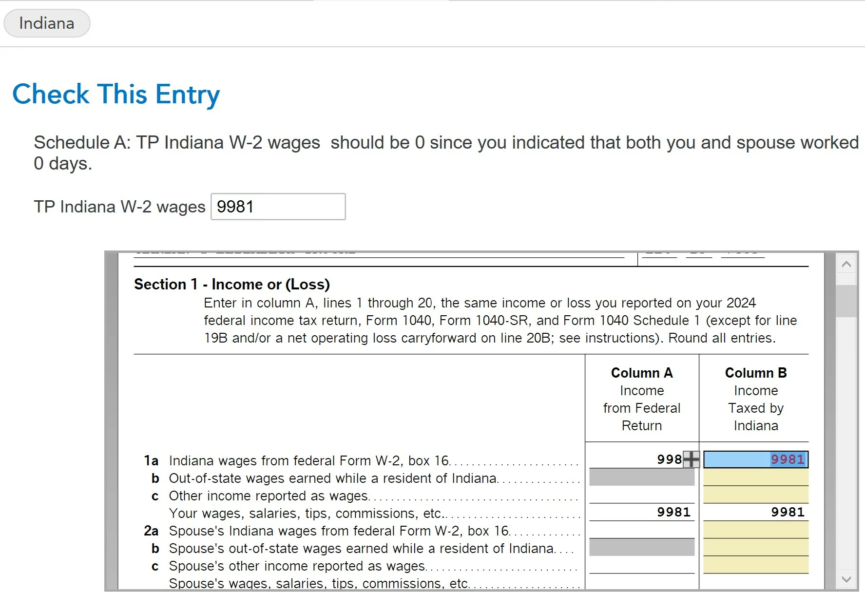 What do I do, is TurboTax not correct ? Or should I include Indiana income and ignore the error check, it reduces my return significantly ?