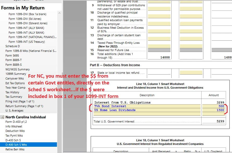 For NC, I've always had to enter TVA & Home loan $$ on the NC deductions "worksheet", the NC Schedule S...and always in Forms Mode.    The worksheet does allow me to make additional entries without overrides.
