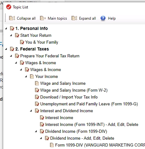 • In section "2. Federal Taxes", in the "Interest and Dividend Income" section, find the dividend that you need to declare. (For my taxes, it was "Form 1099-DIV (VANGUARD MARKETING CORP)"). Click on that dividend