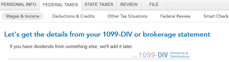 • You should be in a page titled "Let's get the details from your 1099-DIV or brokerage statement". Click the button at the bottom right to continue to the next page