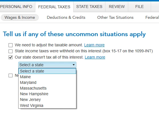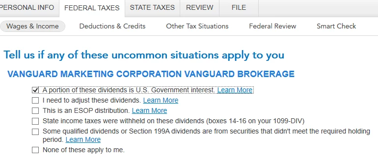 • Keep clicking to the next page until you reach titled "Tell us if any of these uncommon situations apply to you". In that page, check the checkbox titled "A portion of these dividends is U.S. Government interest"