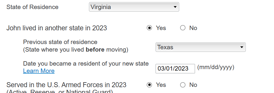 Retired from military in 2023, changed from TX to VA resident