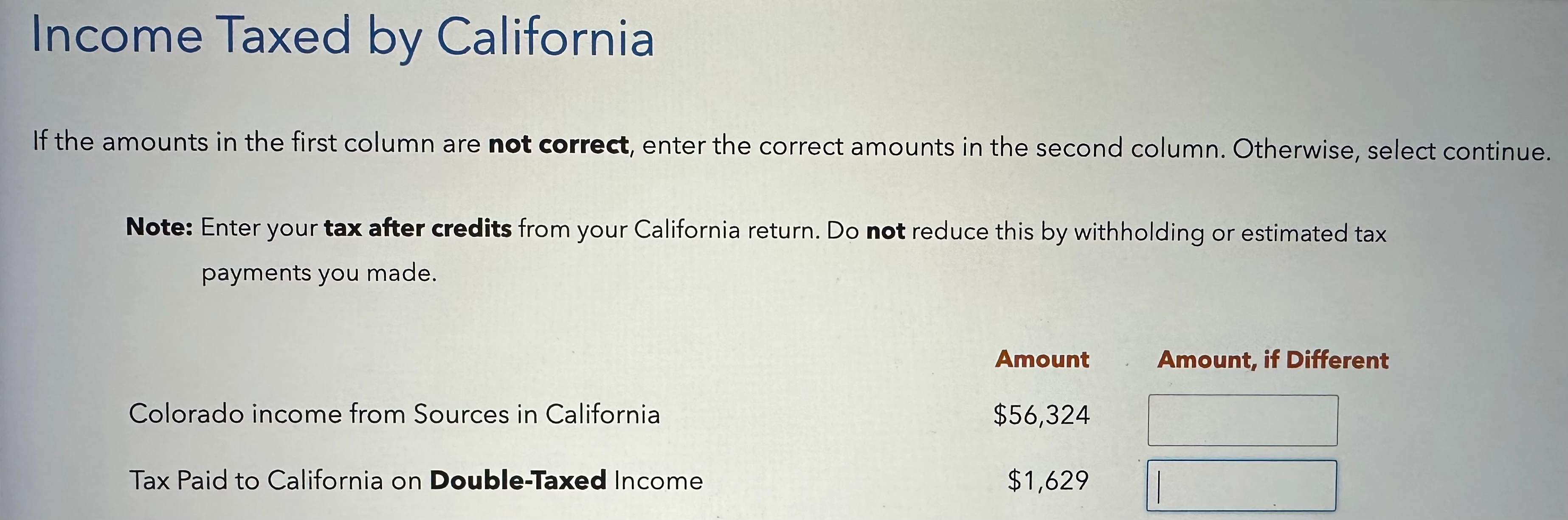Tax paid to California on double-taxed income $1,629 --> Corrected to be $0