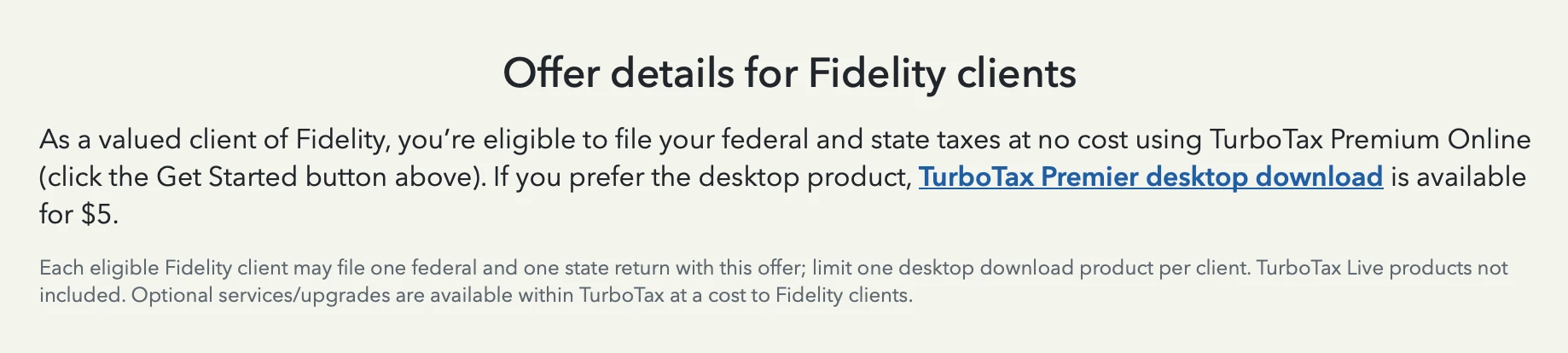 The language on the https://turbotax.intuit.com/affiliate/fidelity page says "may file one federal and one state return with this offer". However, state filing seems to cost $25 extra with Desktop. Is the free state return only working with Online?