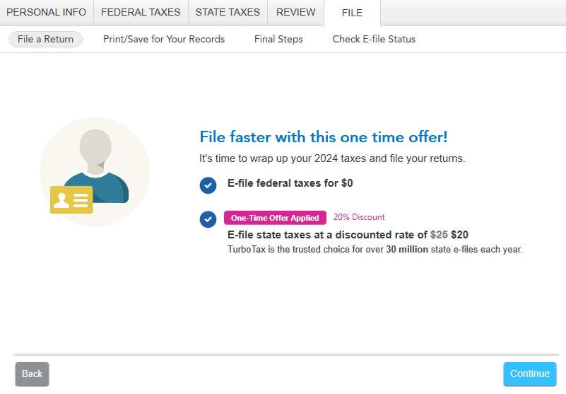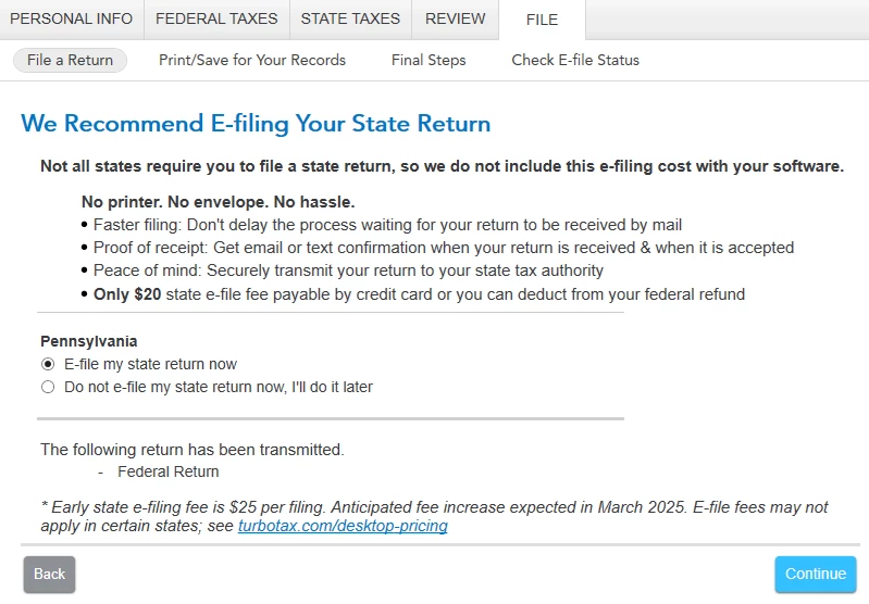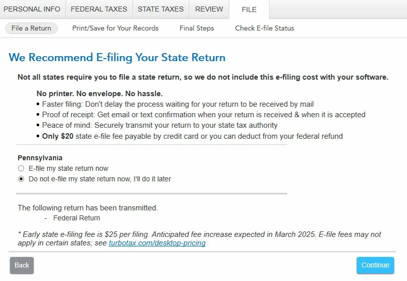 I'm using TurboTax 2024 Deluxe on Windows (Version 024.000.0293). My purchase included a state, which I was able to register successfully (PA) and have prepared my Federal & State returns. My Federal return has been e-filed successfully, but I do not wish to e-file my State return - I wish to submit it manually by printing out the forums and mailing them in.