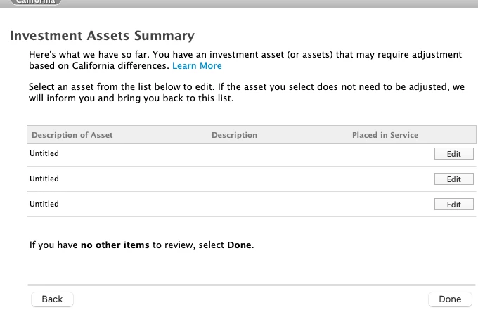 On State Return, under "Investment Assets Summary", I have three "Untitled" assets listed. No option to delete them. Unless I am missing something, I do not see corresponding entries on the Federal side anymore.