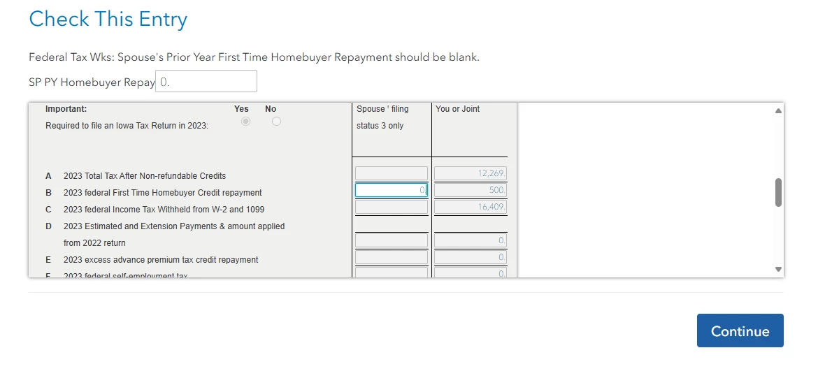 Completecheck is sending me back to my Form IA 1040 Schedule 1 line 18 (B). It's telling me that the box under [Spouse ' filing status 3 only] can't be blank and to put 0 if it doesn't apply. When I enter '0', Completecheck sends me back because the box must be blank.