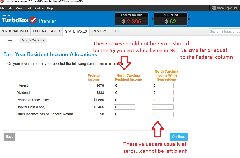 4)  You start the NC part-year tax return.  NC uses ALL your yearly income to calculate a total taxable income..(which, at first, seems wrong) BUT...the software will then lead you thru a bunch of questions where you will indicate/allocate what sub-part of your total yearly income was actually earned and received while living/working in NC.  That allocation of income part will chop down your total yearly income, to the actual NC-related income.....and then apply the NC tax to that chopped down NC-Income.   Whether any NC taxes are actually due will be determined that way.    Any interest, capital gains, and dividends you received after moving to NC must be included in your NC allocations.