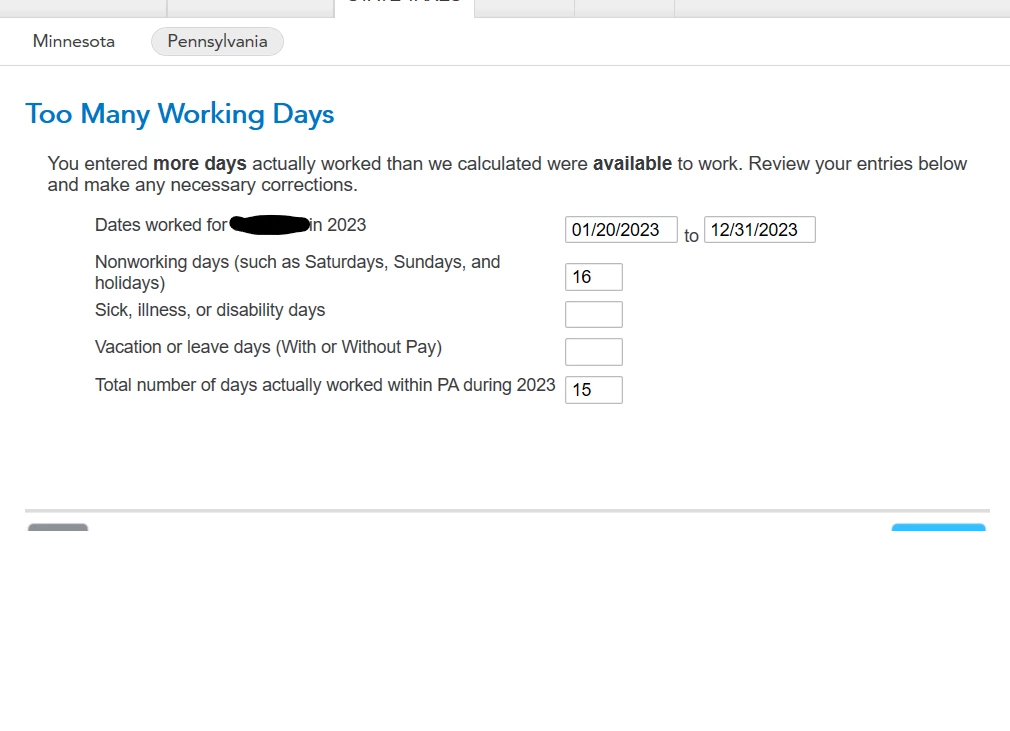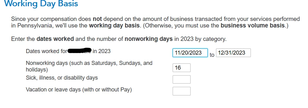 I live in another state and worked in PA in 2023 for about 5 weeks,.. but my PA employer withheld taxes for my resident state. There is a method for calculating the percentage of work days in PA vs total days in Turbo Tax, however it does NOT work. There is a software bug and the software is not calculating correctly; nor am I able to manually enter the correct information direct in the form method. That also is NOT working correctly.