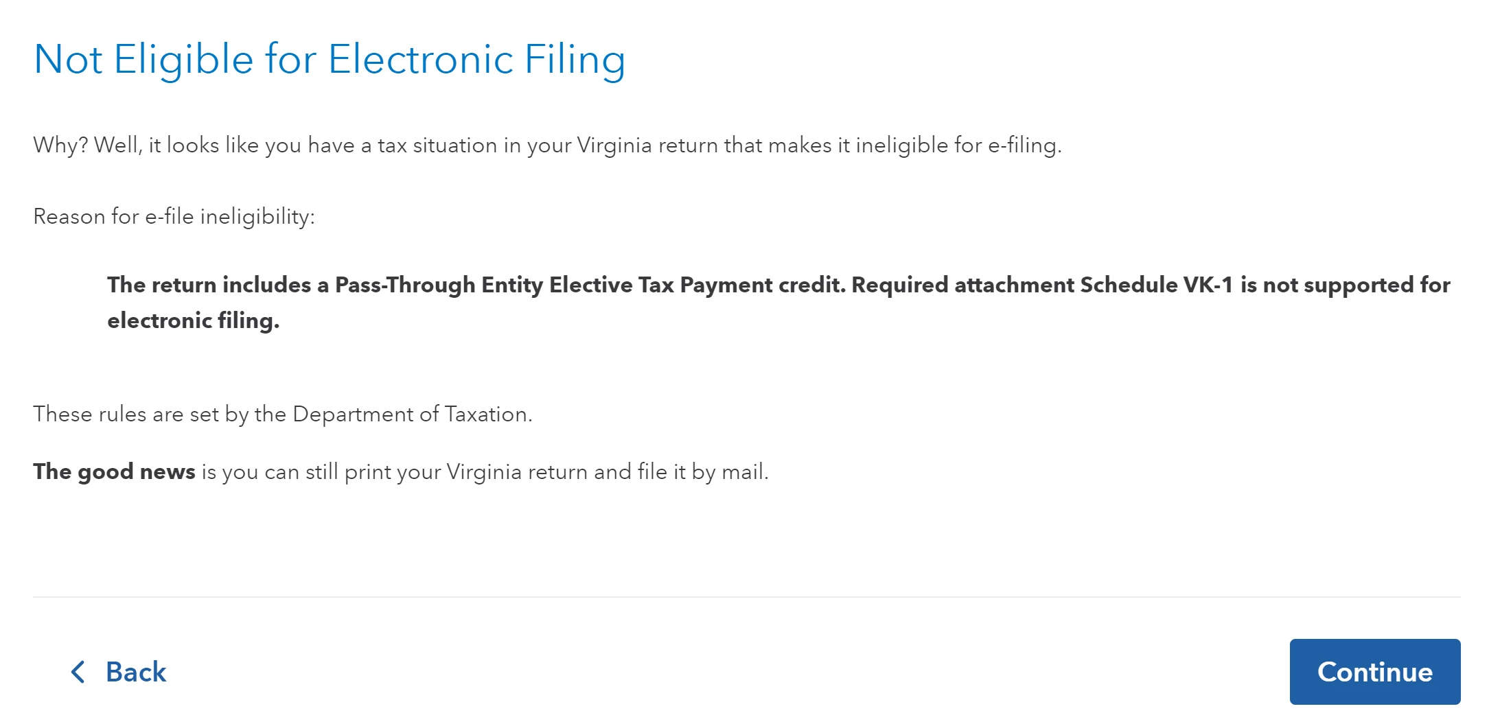 TurboTax Online is telling me that my individual Virginia tax return is not available for e-file due to the fact that I have a Pass Through Entity Tax (PTET) credit. The error message states, "The return includes a Pass-Through Entity Elective Tax Payment credit. Required attachment Schedule VK-1 is not supported for electronic filing." See screenshot below: