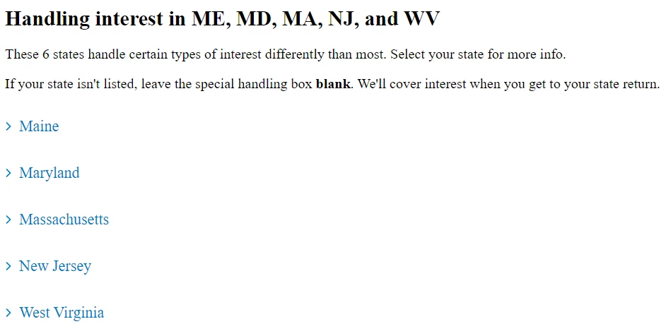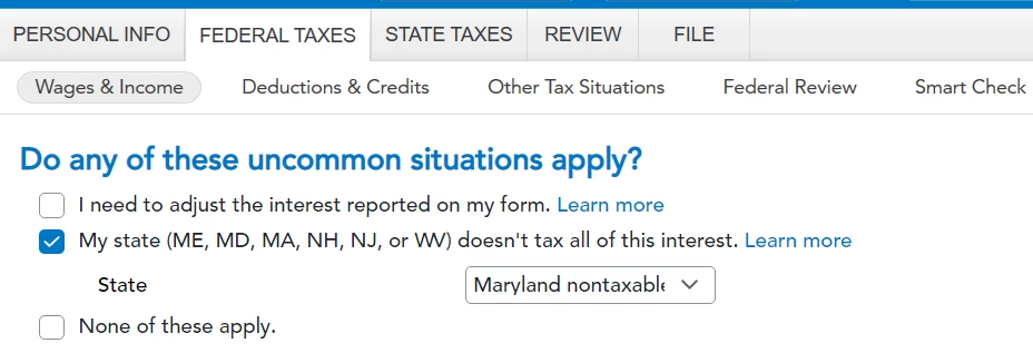 1. I had dividend income from tax-exempt (muni) mutual funds, all of which is not taxable at the federal level. In TT, I entered the breakdown of that income by state (MD and NH) and US territory. The portion of that income derived from NH and US territory obligations is NOT taxable by NH.