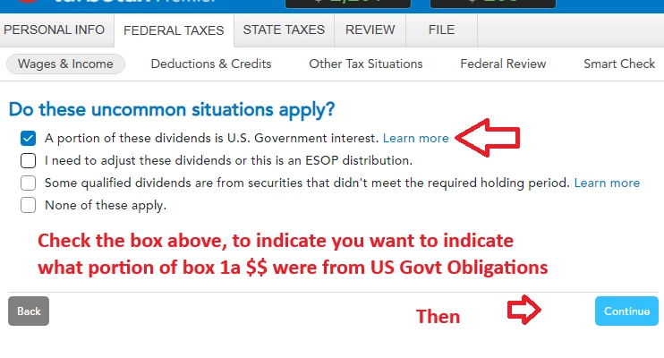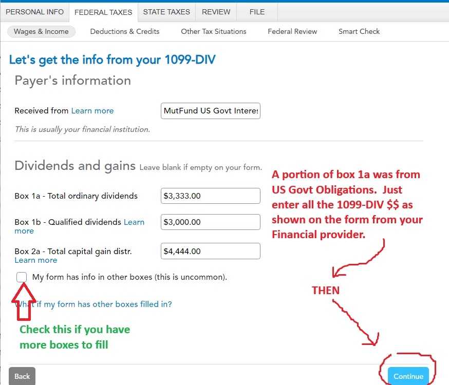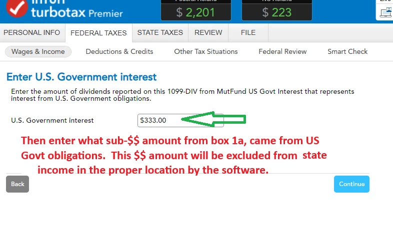 You then edit the 1099-DIV, and on the pages AFTER the main 1099-DIV form, you check a box indicating you have some US Govt interest for that 1099-DIV form, then enter the exact $$ amount on a subsequent page:
