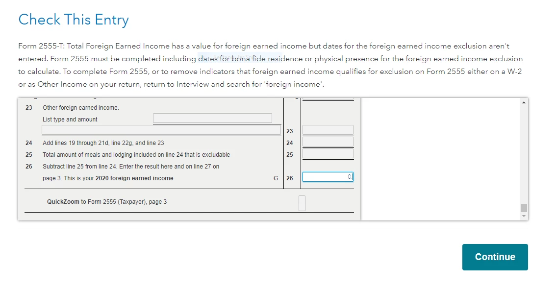 When I go to file my taxes near the end it keeps asking me to fill out form 2555 and it has been putting me in a circle how am I