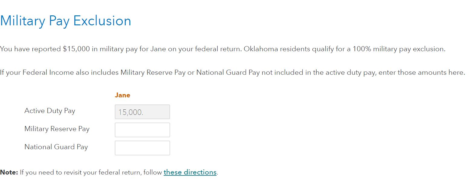 During the Oklahoma State interview, you will get the screen “Military Pay Exclusion” where you can verify the active-duty pay carried over from the federal interview. You can also enter any Reserve pay that wasn’t included in the active-duty pay.