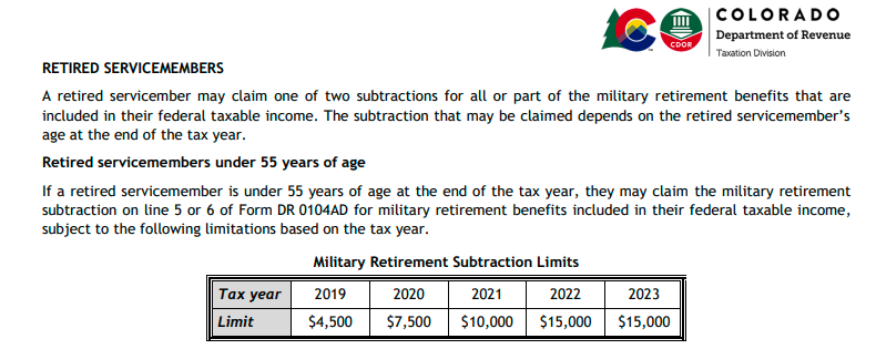 CO military retirement pay exclusion is controlled by age. Those under age 55 can exclude up to $7,500. those ages 55-64 can exclude up to $20,000. those age 65 and over can exclude up to $24,000.