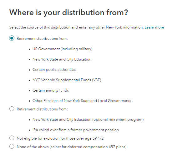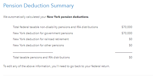 I'm retired military and a resident of Mississippi. My wife earned income in NY last year, so we need to file a NY state tax return. We are filing married filing jointly. When I fill out the forms and it brings in our federal amounts, it takes into account my military retirement pay. I adjust the taxable income for NY to the amounts that she earned in NY, but it still uses our federal amount since it's higher. This means it's trying to tax my military retirement.