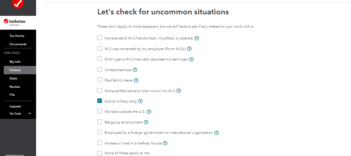 Please ensure that you checked the active-duty military box for the W-2 on the "Do any of these uncommon situations apply to this W-2?" screen right after you enter your W-2.